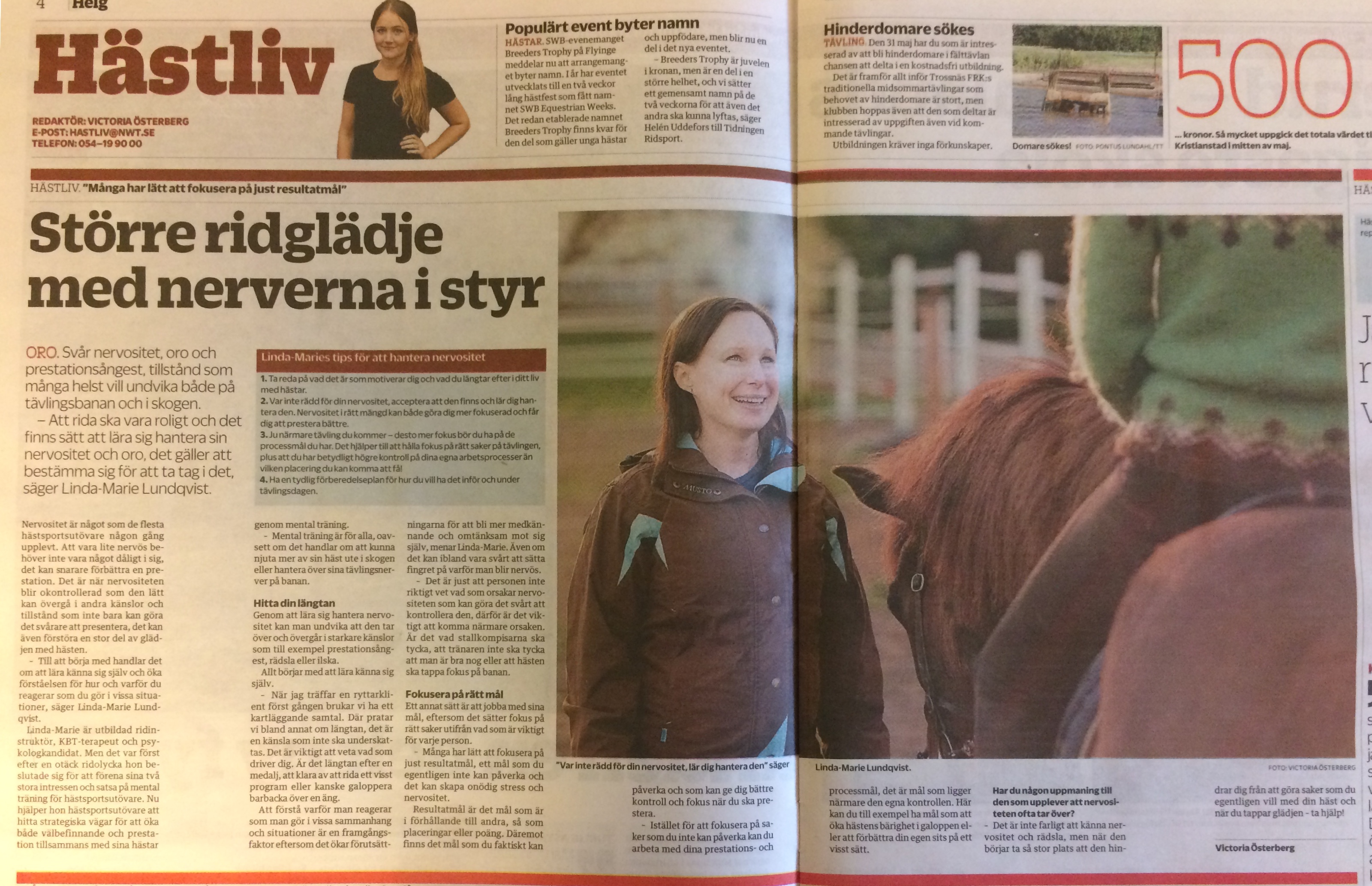 I lördagens Nya Wermlands Tidning, NWT, kunde man läsa ett reportage om mig där jag talar om hantering av nervositet i ridningen. Det var med andra ord en händelserik dag den 25/5 med både tidningsreportage och hästmässa!