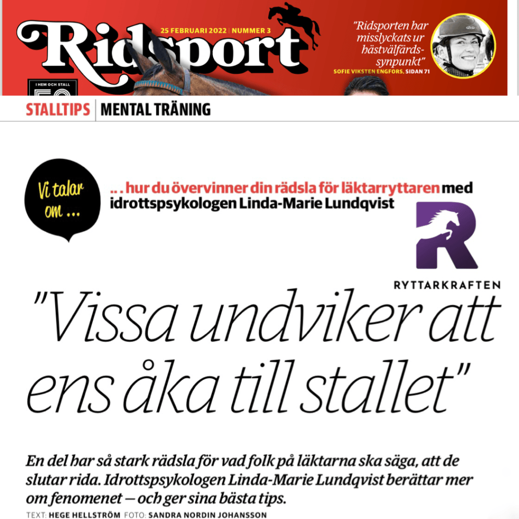 I Ridsport nr 3 2022 kan du läsa mina tankar och tips kring ”läktarskräck”, d.v.s. rädslan för att bli negativt bedömd av dem som ser på när du rider. Stark rädsla för att andra ska tycka man är dålig, konstig eller okunnig är faktiskt en av de absolut vanligaste orsakerna till att ryttare (och även instruktörer och tränare) söker hjälp hos mig. Rädslan resulterar till slut i att ridglädjen och motivationen tynar bort i takt med att ryttaren på olika sätt försöker undvika situationer där man riskerar att bli iakttagen och granskad av andra.